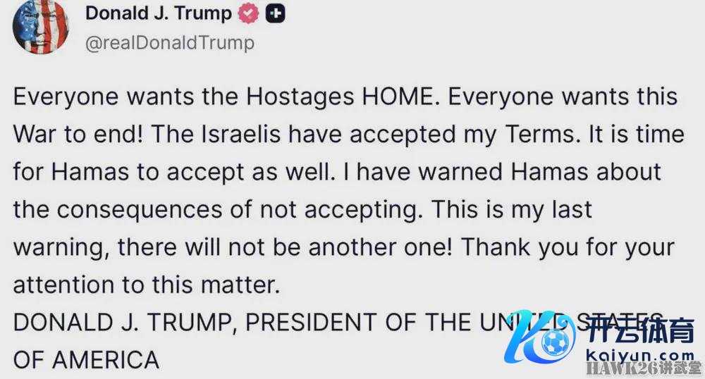 值得一提的是,就在上周末,好意思国总统唐纳德·特朗普在其社交媒体平台“真确社交(Truth Social)”上发帖,向哈马斯发出了他所谓的“终末告诫”,告诫哈马斯“不收受”拟议和谈公约的服从。